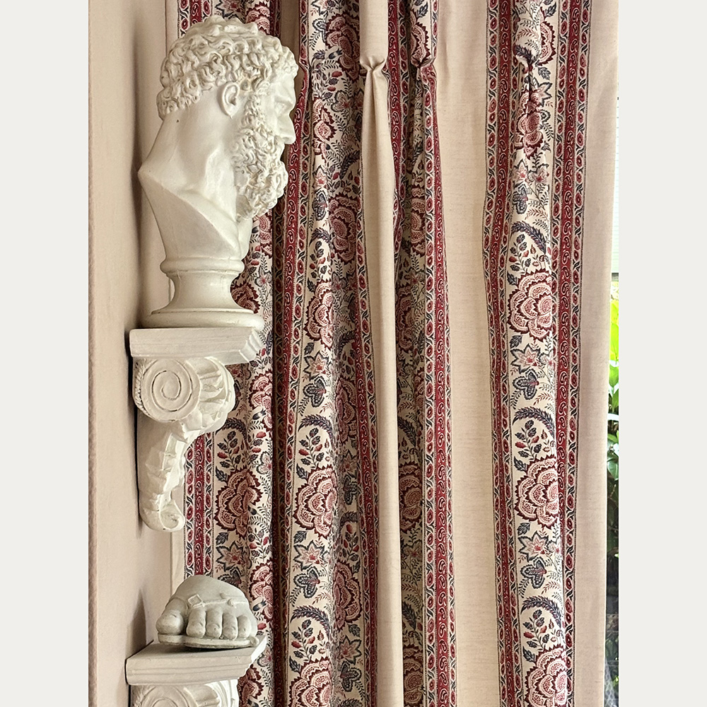 A decorative Indienne stripe design, hand painted in watercolour, with lots of tonal movement to give the effect of a traditional block print. Get in touch if you would like a plain fabric printed with the ground colour if you would like to use it as a border. A four across repeat.